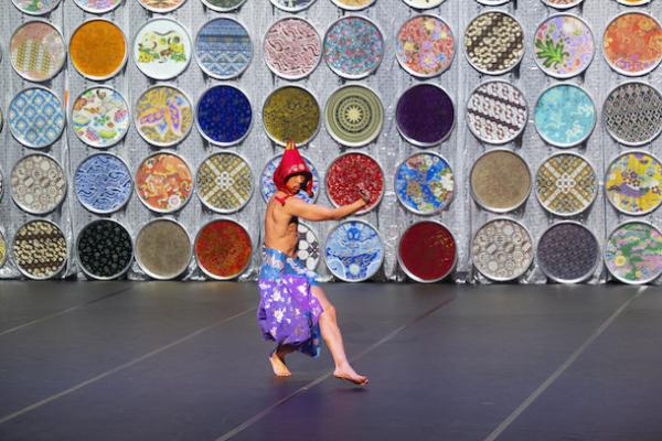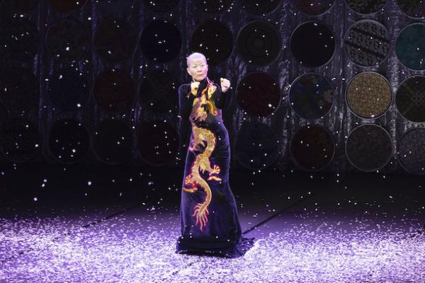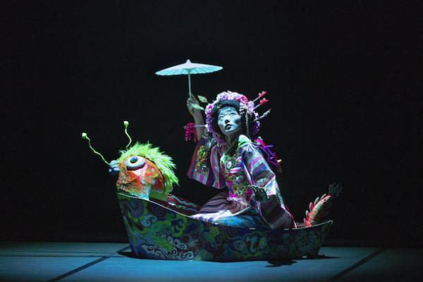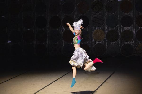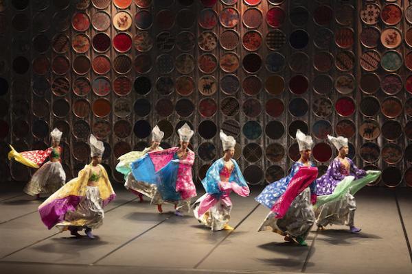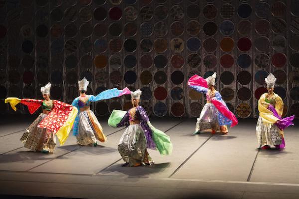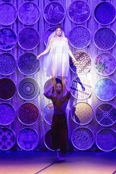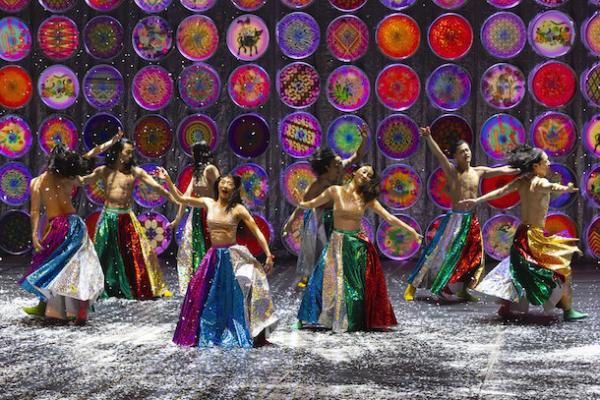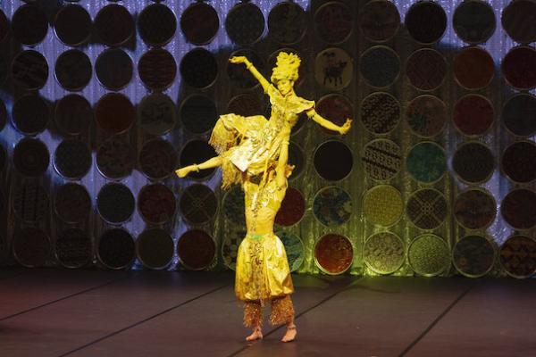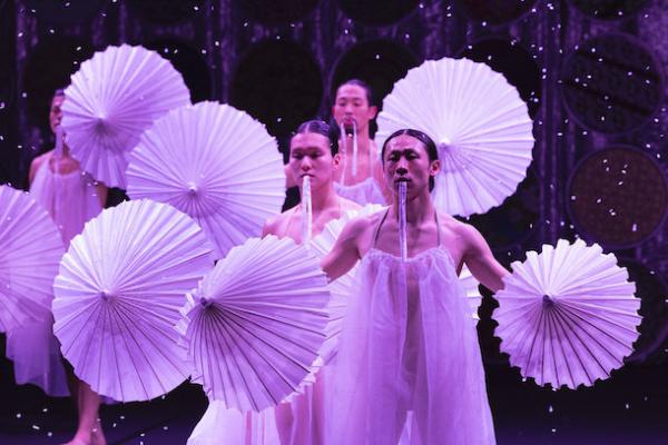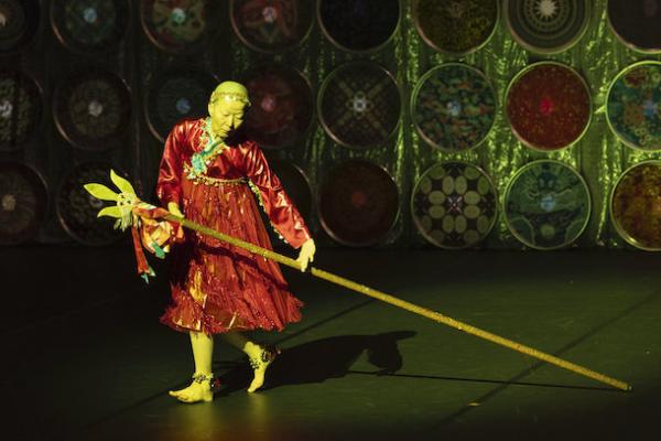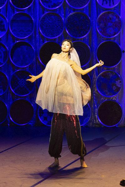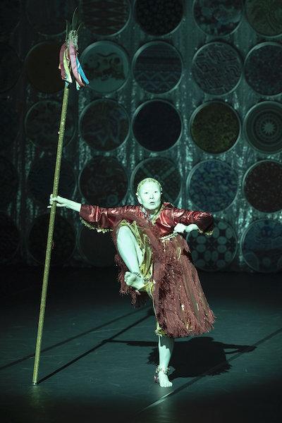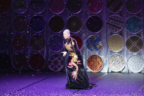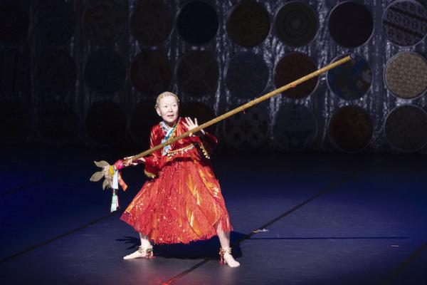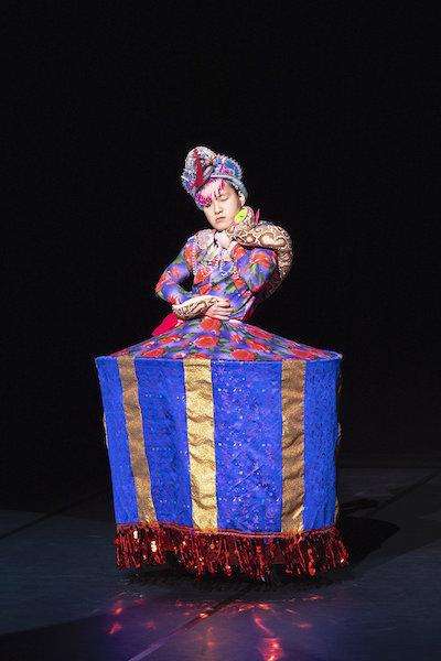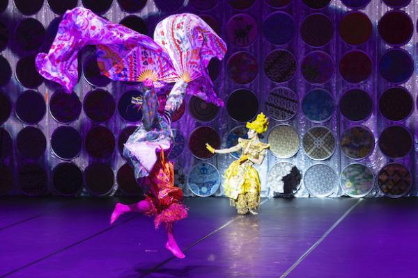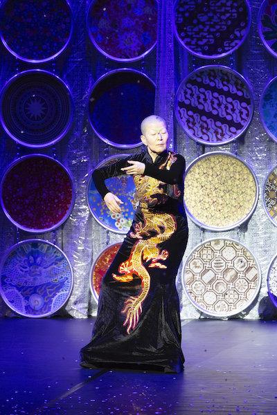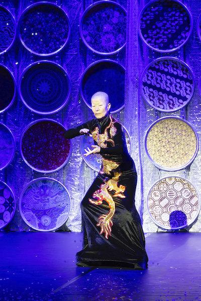 Pas certain qu’Eun-Me Ahn connaisse Segalen, mais un peu du poète breton ne nuit pas pour appréhender sa nouvelle création, ne serait-ce que pour prévenir les malentendus. Car Post-Orientalist Express peut déconcerter… Véritable maelström d’images et de saynètes enchaînées à toute vitesse, passant de la jeune femme à l’ombrelle, pour fond de verre à liqueur (mais pour tout public quand même), aux deux masques marchant sur les mains avec des airs de dragons informes et qui, sautant sur leurs pieds, retournent le costume, devenu sobres jupes blanches, les transformant en austères danseurs butô, kaolin en moins. On y croise des saris, des coiffes fleuries, des bouddhas dorés, des émules de Bruce Lee avec nunchakus, des super-héros de dessins animés façon Chevaliers du Zodiaque du studio Toei Animation, un étourdissant mélange flashy, au gré des 90 costumes créés par la chorégraphe, qui démultiplient l’effectif au point qu’il faut un certain temps pour mesurer qu’ils ne sont que huit… La chorégraphe elle-même s’ajoute à l’effectif à l’occasion de deux solos ; comme le faisait dame Pina en son temps, mais en plus débridé.