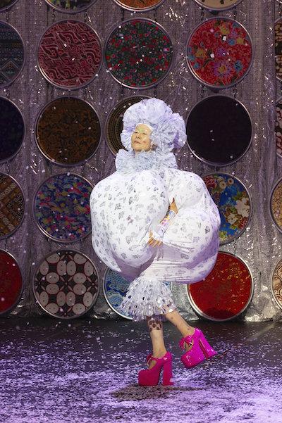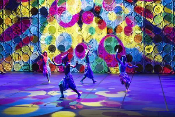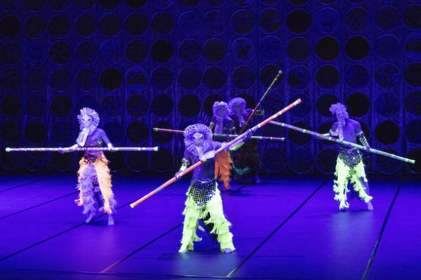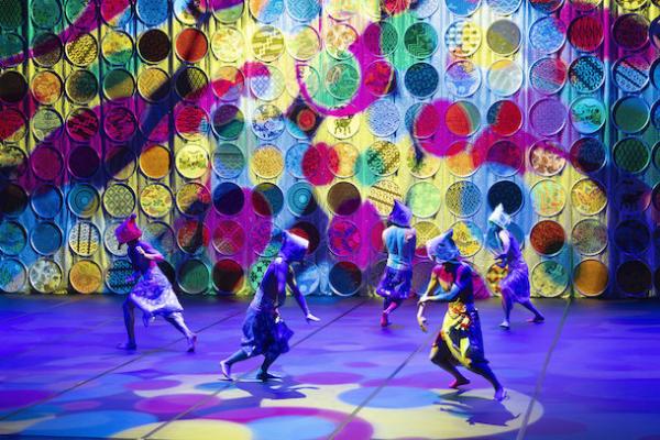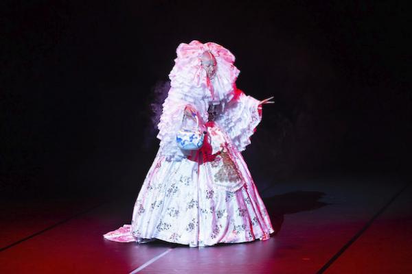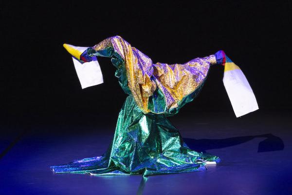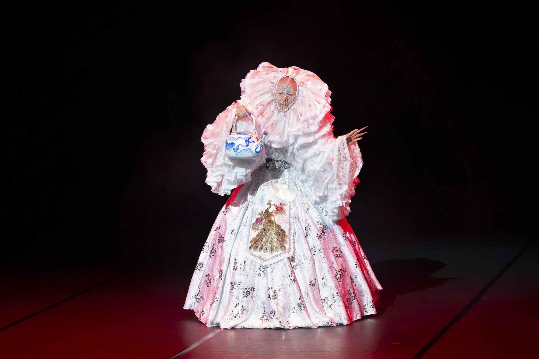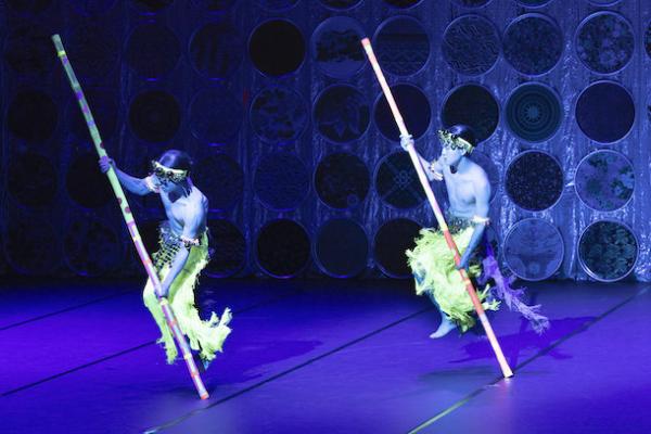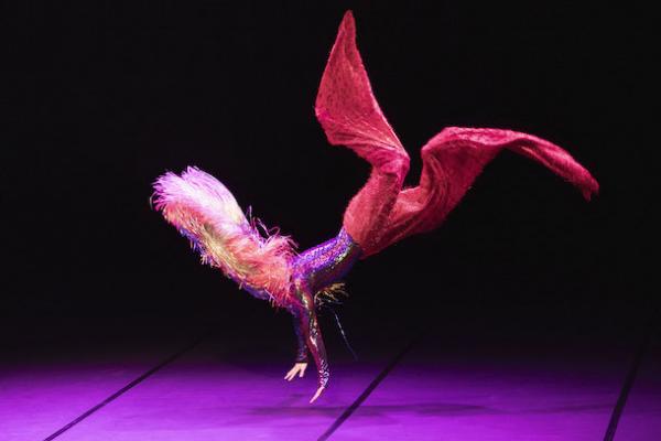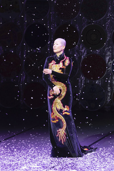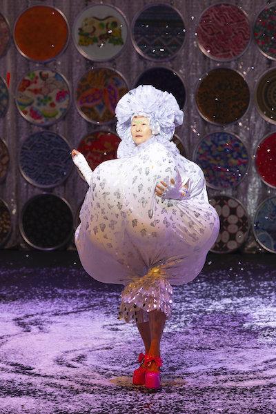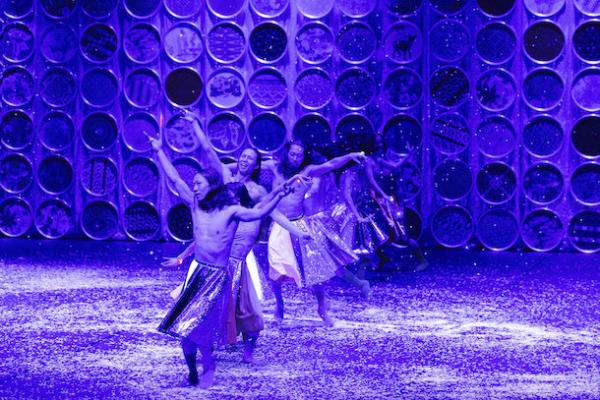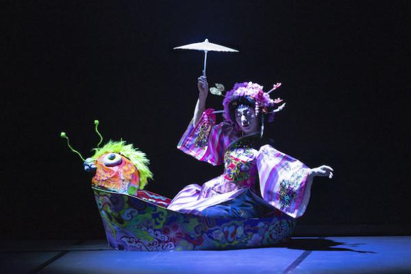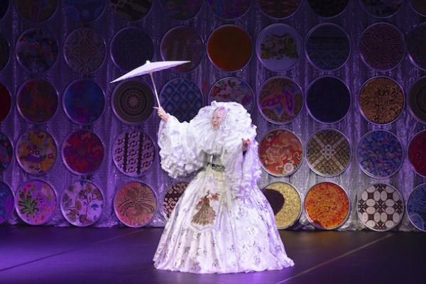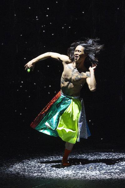 Pas certain qu’Eun-Me Ahn connaisse Segalen, mais un peu du poète breton ne nuit pas pour appréhender sa nouvelle création, ne serait-ce que pour prévenir les malentendus. Car Post-Orientalist Express peut déconcerter… Véritable maelström d’images et de saynètes enchaînées à toute vitesse, passant de la jeune femme à l’ombrelle, pour fond de verre à liqueur (mais pour tout public quand même), aux deux masques marchant sur les mains avec des airs de dragons informes et qui, sautant sur leurs pieds, retournent le costume, devenu sobres jupes blanches, les transformant en austères danseurs butô, kaolin en moins. On y croise des saris, des coiffes fleuries, des bouddhas dorés, des émules de Bruce Lee avec nunchakus, des super-héros de dessins animés façon Chevaliers du Zodiaque du studio Toei Animation, un étourdissant mélange flashy, au gré des 90 costumes créés par la chorégraphe, qui démultiplient l’effectif au point qu’il faut un certain temps pour mesurer qu’ils ne sont que huit… La chorégraphe elle-même s’ajoute à l’effectif à l’occasion de deux solos ; comme le faisait dame Pina en son temps, mais en plus débridé.