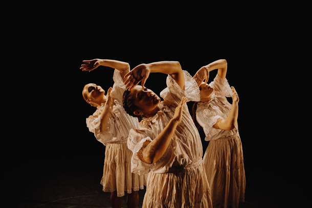 Dans son trio féminin Potomitan, Jade Lada « explore la force et la résilience des femmes-piliers » de la société antillaise en partant sur les « parcours d’émancipation ». Et d’ajouter : « C’est un hommage à ma grand-mère Denise Doressamy Lada, une femme combative, courageuse et rassembleuse. » Cette pièce dessinant un parcours vers la liberté, on perçoit d’abord une panoplie d’énergies qui s’imposent aux femmes. Le trio avance en unisson et en demi-automates, le buste immobile, droit ou penché vers l’avant, sur des rythmes traversés par l’héritage antillais dans ce qui est peut-être une forme de transe, se battant contre des inerties inhérentes aux corps et aux ambiances.