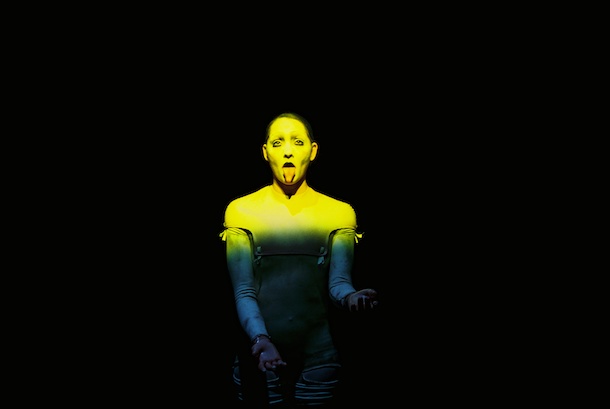 Rebecca Journo : Le costume a été conçu avec Coline Ploquin, avec laquelle je collabore depuis longtemps. Nous avons cherché du côté des poupées, des pantins, des corps rafistolés. L’idée du corps-objet, du corps-pantin, s’est imposée. Le costume est un montage, un collage de différents éléments, comme un corps de poupée fabriqué de bric et de broc. Avec la maquilleuse nous avons travaillé sur un maquillage expressif, qui évoque aussi le cinéma expressionniste. Le corps est statique, les gestes sont minimalistes, donc le maquillage prend tout son sens. Il participe pleinement à la création de l’univers.