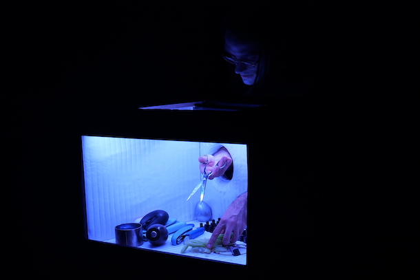 Rebecca Journo : Nous sommes deux. Mathieu est au son, en direct, et moi je suis au geste. Les objets sont présents sur scène, dans une boîte. La scénographie est très simple : une boîte équipée de micros, dans laquelle tout le paysage sonore est produit en direct. Ce qui impose un resserrement d’échelle : tout est petit, limité. On ne peut pas multiplier les objets. Chaque geste est restreint par cet espace réduit. On a poussé cette logique jusqu’à un certain paroxysme.