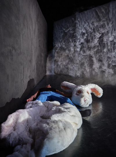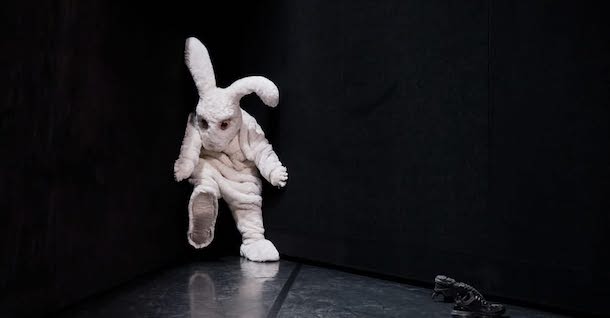Tout commence par un lapin géant, maladroit, qui se hisse tant bien que mal au-dessus de l’une de ces parois. On pense, à un personnage échappé d’un parc d’attractions, à un rêve d’enfant qui aurait mal tourné, ou au célèbre Lapin blanc de Lewis Carroll. Le voilà de l’autre côté du mur, comme de l’autre côté du miroir, projeté dans une autre réalité où l’agitation s’est tue. Peur du silence ? Du noir ? De nous ? Il se précipite dans l’angle le plus obtus pour chercher une échappatoire… Le décor, réduit à l’essentiel, agit comme une chambre d’échos où chaque geste se heurte à une limite, chaque tentative d’avancer se transforme en lutte.