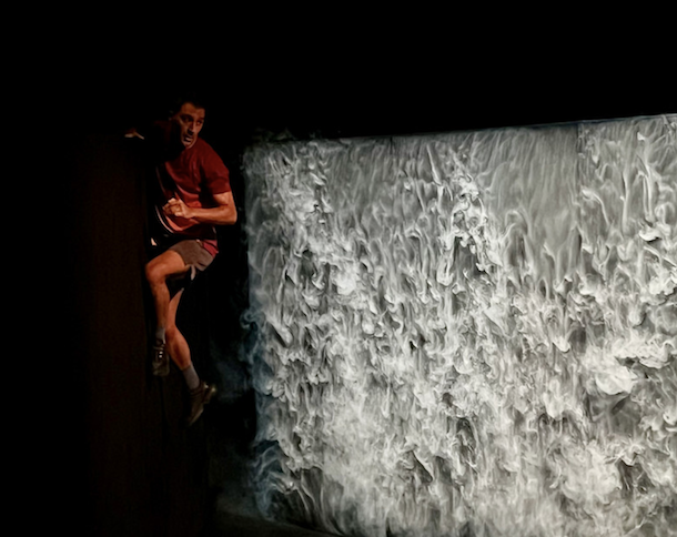 Puis la fumée apparaît. Au début, nous ne l’identifions pas comme telle. Elle coule, remonte, se déploie en nappes épaisses ou en filaments délicats. Elle devient cascade, chevelure, nuage, souffle. Non pas comme un effet, mais comme une matière vivante. Une chute d’où s’échapperait une brume d’eau. Elle se glisse dans les interstices du décor, s’échappe par un mur poreux, se densifie au sol jusqu’à engloutir le danseur. Antoine Friderici, son concepteur, en fait un véritable paysage mouvant, un tableau en perpétuelle métamorphose qui nous hypnotise. Philippe Saire en joue et invente une véritable partenaire de jeu, imprévisible, parfois indocile, qui oblige le danseur à adapter son mouvement, à composer avec ce qui lui échappe.