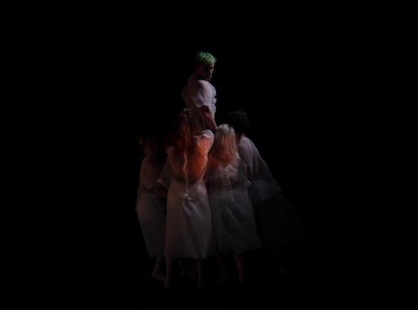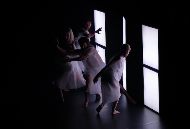 Reste qu’intégrés pleinement au vocabulaire chorégraphique, ces éléments organisent et dessinent l’espace scénique, tour à tour paroi, passage, refuge ou signal. Ils pourraient monopoliser l’attention. Mais un autre élément détourne de ce jeu de déménagement.