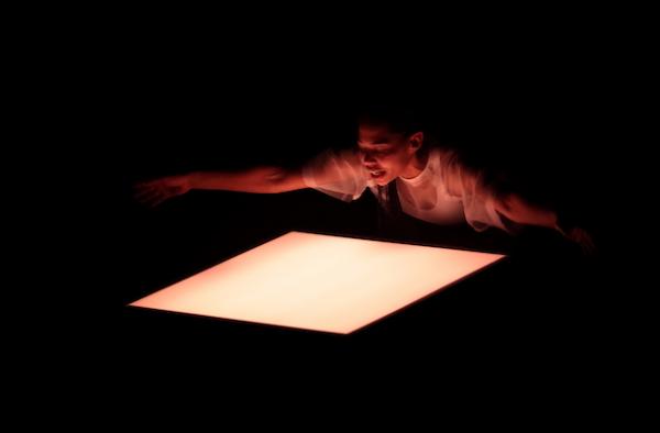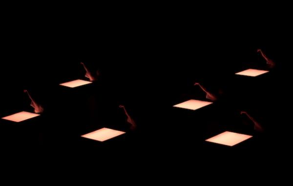 Quelque chose de crépusculaire et de dévasté : dans un air enfumé, un chaos de blocs sombres, à cour. Des corps y gisent. Dès qu’ils s’animent, ils commencent à déplacer ces modules carrés et les empilent en une sorte de mur ; très rapidement, ces cadres se révèlent mobiles et lumineux, diffusant des teintes changeantes (pilotées depuis la régie). Ils vont structurer la pièce, poussant la gestuelle vers des postures de soutien, d’effort, d’architecture, quand les six interprètes les transportent, les déposent au sol, les soulèvent à bout de bras. Pas simple : ils pèsent une vingtaine de kilos… Mais l’imaginaire se projette et peut y trouver des ouvertures, des fragments de ciel, des surfaces d’écran ou des reflets miroitants ; ou simplement des cadres lumineux qui fabriquent un univers…