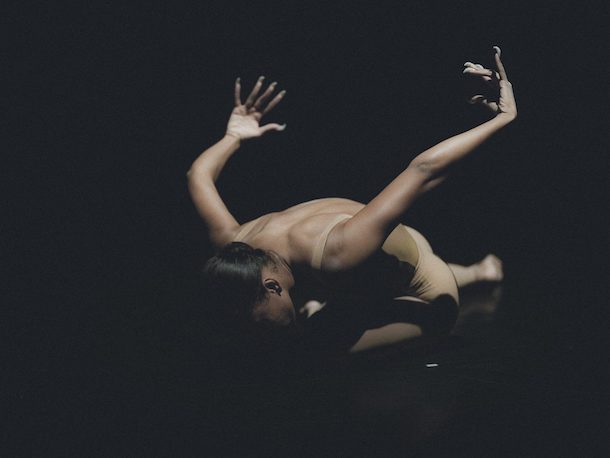 Elle a opté pour un solo sur une musique d’Ulysse Zangs d’après Franz Schubert. L’image qui s’impose n’est pas celle de la princesse. « Sven est une créature hybride : cygne, monstre et humaine qui a la capacité de s’adapter à la destruction de son milieu de vie grâce à ses métamorphoses » explique Héloïse Jocqueriel. Il y a une vision très unisexe dans sa proposition chorégraphique. Vêtue d’un justaucorps, évoluant dans un halo de lumière, Awa Joannais enchaine une série très lente de développés, se hissant à l’extrême sur demi pointes. Mi femme, Mi oiseau, elle réalise un travail du dos très précis, d’une absolue sensualité, s’arrondissant pour se redresser. Mais ce qui fascine, c’est l’utilisation des mains, doigts écartés qui évoquent davantage le cygne noir maléfique. À mesure qu’Awa Joannais déploie ses ailes, c’est aussi une autre référence qui vient à l’esprit : celle de La Mort du Cygne de Michel Fokine qui imagina pour Anna Pavlova les derniers instants de la vie d’un cygne. Sans artifices, Héloïse Jocqueriel bâtit un solo délicat porté par un travail des bras phénoménal qui décrit les différentes étapes de la métamorphose entre l’humain et l’animal.