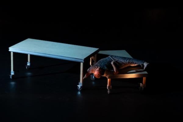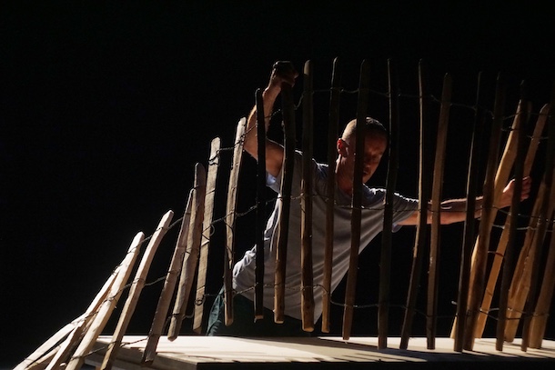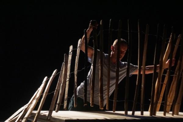 Dans Troglodyte, il s’enferme sous une table qu’il transforme en agrès absurde, avec lequel il traverse la scène, enfermé dans la vie ordinaire. Non sans dérouler, plus tard, une palissade portable et avec elle, toute l’ironie de son jeu avec les mots et les envies d’une vie bucolique. Il peut aussi se réfugier derrière un écran pour se faire filmer de haut et apparaître de l’autre côté, tel un fantôme de lui-même, reflet de ses propres angoisses.