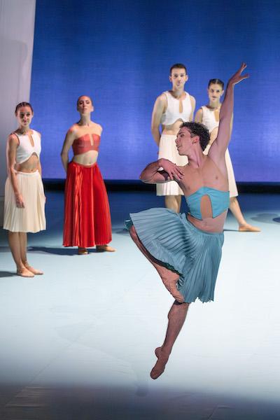 En brillant historien et archéologue de la danse, Thierry Malandain s’inscrit dans cet héritage et avec une géniale humilité raconte cette histoire désuète mais charmante qui narre sur fond de pastorale l’éveil amoureux de deux adolescents. Trois longues colonnes de tissu blanc campent le décor en référence au roman grec antique dont est issu le livret. Jorge Gallardo, fidèle collaborateur de Thierry Malandain a dessiné des costumes unisexes où garçons et filles portent vaillamment des jupettes et des bustiers qui changent de couleur au fil de l’histoire.