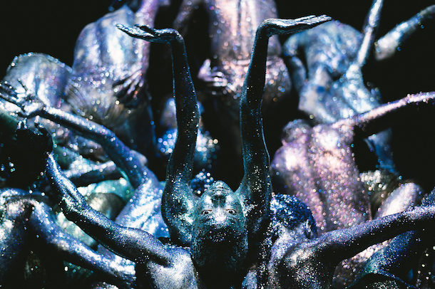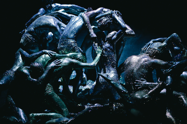 L’un des épisodes marquants reste ce cercle de danseurs et danseuses assis, leurs torses et bras ondulant dans un ballet sous-marin. Éclairés par un cône de lumière, leurs mouvements évoquent l’éclosion lente d’une anémone, la corolle d’une fleur marine. Ici, la chorégraphie de Jalet trouve son souffle. La précision du geste – chaque doigt, chaque orientation du buste – ne tue pas le vivant ; elle le révèle.