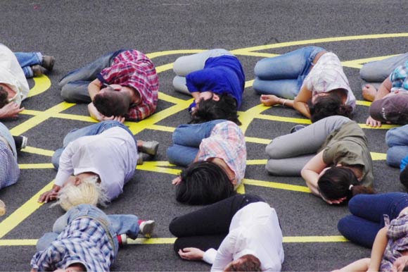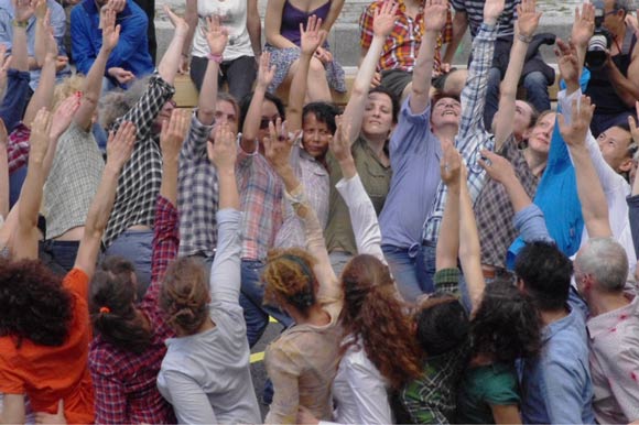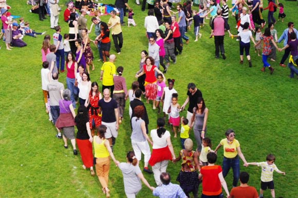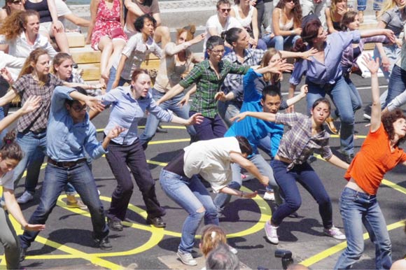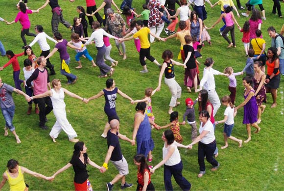 « Made in… » pourrait bien se dérouler n’importe où sur la planète, mais pas en même temps. Par contre, la « Planetary Dance » créé par Anna Halprin est de plus en plus disséminée à travers le monde. A Paris, les participants du 16 juin ont bénéficié d’un ciel clément. Ils s’étaient retrouvés au Parc de Reuilly, invités par le CDC Paris réseau et le CDD Val-de-Marne. Comme l’a rappelé Fabrice Dugied du Regard du Cygne, « Les Pygmées disent que quand on sait marcher, on sait danser. » Le cercle est ici la figure de départ, d’arrivée et de passage, même si des lignes plus sinueuse peuvent s’y glisser. Au début, chacun disait son nom et faisait un geste qui était immédiatement repris par les convives formant un rond assez large, car on comptait bien plus d’une centaine de participants