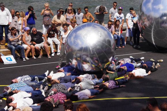 « Made in… » est un concept de Leighton, créé à Strasbourg fin 2010. Des dizaines d’amateurs, qu’ils pratiquent la danse ou pas, interprètent une chorégraphie basée sur les mouvements présents dans la nature, tels des tourbillons, vortex ou autres mouvements qui font que des feuilles mortes se rassemblent et se dispersent. Deux grandes sphères argentées participent à la chorégraphie, comme deux énormes balles de gymnastique. Il n’y a aucun dress code pour les participants, mais les chemises à carrés étaient clairement dominants, comme les femmes par ailleurs.