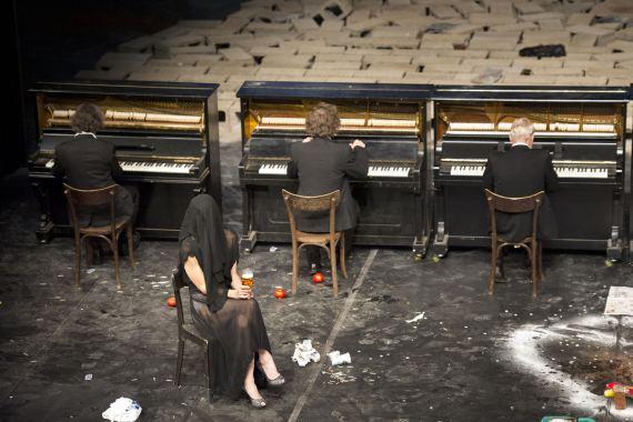 Aujourd’hui, le personnel du Théâtre de la Ville monte sur scène avant le début pour expliquer au public la casse de l’assurance chômage des intermittents. Lutz Förster, le directeur artistique du Tanztheater Wuppertal, exprime sa solidarité. À la fin, chacun enlève une chaussure et sort de scène en éclopé, pace que « sans les intermittents, la culture ne marche pas, elle est boiteuse ». C‘est digne d’un tableau de la pièce à venir. Si l’action ne changera rien au sort de précaires dans ce pays, au moins le public est conquis.