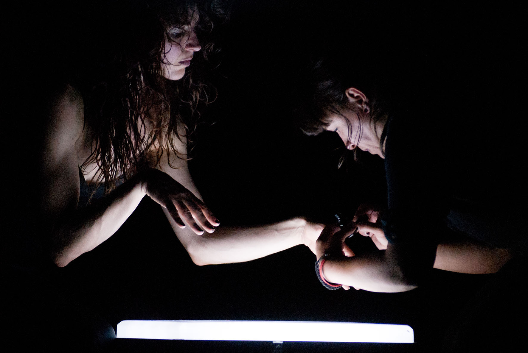 La caméra, quant à elle, continue d’enregistrer des images, genre caméra de surveillance qui rend compte de la fin de l’humanité tandis que la pièce s’enfonce toujours plus profondément dans les ténèbres d’un inconscient aussi sombre que les éclats du plateau.
