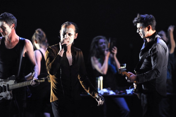 Ils n'y sont pas seuls. Opium réunit un effectif exceptionnellement développé pour cette compagnie. Les deux précédemment mentionnés y sont rejoints par trois musiciens d'obédience rock, une autre danseuse, une chanteuse, une comédienne. Cette opulence de moyens humains entre en contradiction avec le décorum frustre du théâtre de l'Odéon à Nîmes. Et cette tension entre en résonance avec ce que cette pièce peut avoir de quasi underground.