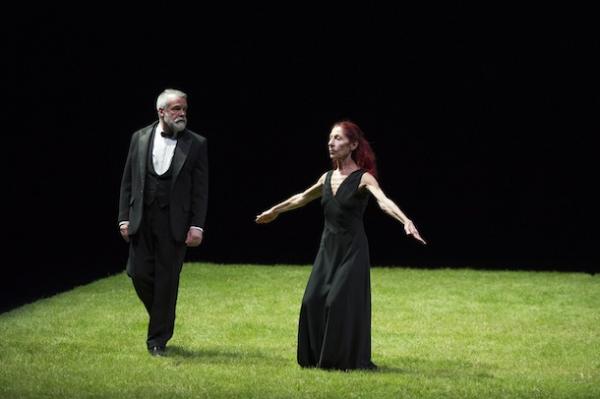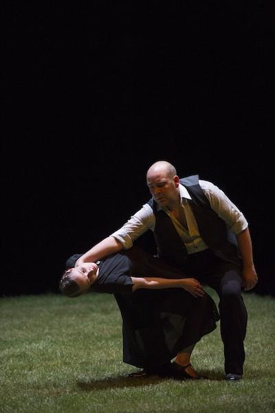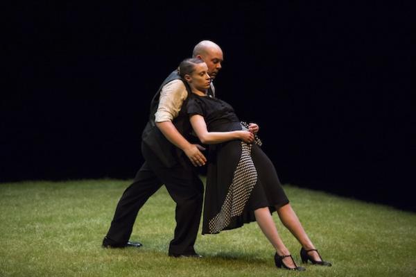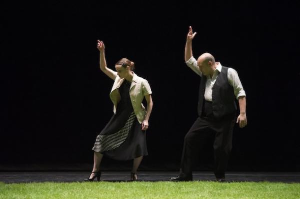 Un couple. Daniel Larrieu et Odile Azagury interprètent deux personnages de pur théâtre, mûrs et d’une élégance désuète. Leur attitude distinguée peut dater d’avant ou d’après tous ces événements de la vie qui défilent en arrière-plan et qui font qu’on se sépare et se retrouve comme elle et lui, à plusieurs reprises, au cours de la soirée. Au fond, derrière le carré vert, défilent les autres danseurs et évoquent une panoplie d’événements et d’émotions, scènes de fête ou de violence. Avec eux, la vie défile.