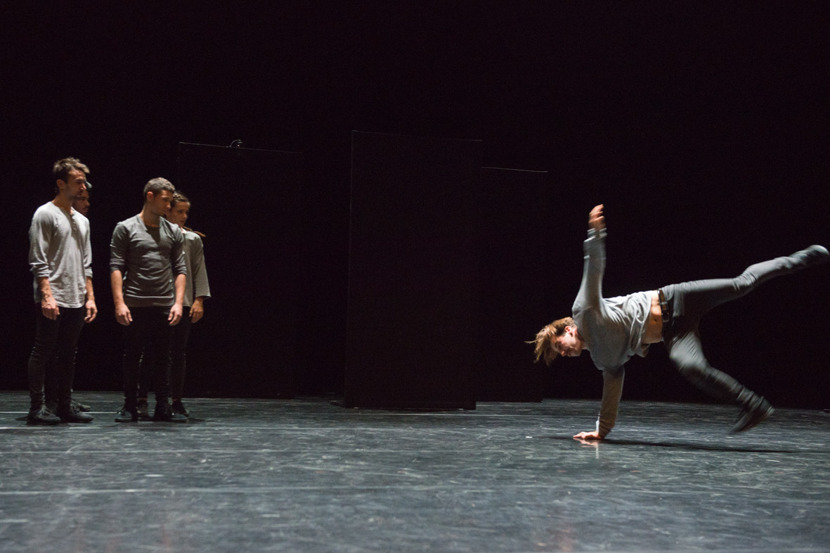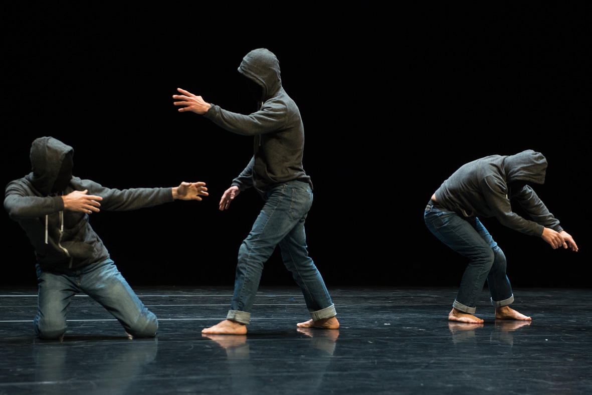 La mécanique des ombres qui réunit le trio de danseurs-acrobates et chorégraphes cités, est une pièce très aboutie. Sur scène, les visages sont masqués, les corps vêtus d’un jean et d’un sweat à capuche relevée. Sylvain Bouillet, Mathieu Desseigne et Lucien Reynès expérimentent des gestes, s’essaient dans d’étranges solos désarticulés. Luttant sans cesse à la fois contre le déséquilibre et la gravité, leur gestuelle, imprégnée de hip hop et de langage contemporaine, alterne entre le musculeux et la poupée de chiffon avant de s’engager dans des performances physiques époustouflantes. Il n’est pas surprenant que cette chorégraphie ait conquis le public, grâce à une dramturgie subtile qui mêle un poétique urbain à une physicallité hors-norme. On regrette juste le début, qui montre le jeu des muscles dorsaux dans la pénombre, ait déjà été vu et utilisé par nombre de chorégraphes, à commencer par le très beau solo de David Drouard.