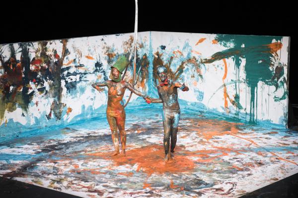 Tamar Shelef et David Wampach ont opté pour des séquences de danse ponctuées dans le sol jusqu'à épuisement, que ce soit sur place, ou en sautillant, ou bondissant. Cela peut frôler la drôlerie bouffone. Parfois produire du personnage, sur-maquillé de matières, qui ne renierait pas le versant cabaret des arts scéniques. L'autre versant s'inscrit dans de cinglantes ondulations oscillantes de toute la colonne dorsale, sèches et fondamentales, en flexions, extensions, qui ne sont évidemment pas indemnes d'un solide travail sur la respiration, très investie, sonore.