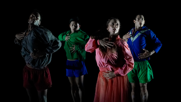Une grande forme étoilée géométrique est inscrite en blanc sur le fond noir du tapis de danse. Dans une profonde pénombre, les cinq interprètes danseur.se.s patientent, à l'extrême bord de la cage de scène. Le travail du son, par Floy Krouchi, confère une vaste proportion, pleine de hauteur, à la subtile puissance vibratoire qu'on pressent dans ce lieu.
