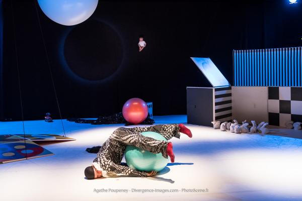 Côté accessoires, nous avons donc: Des ballons à sauter, la marionnette ballerine suspendue au plafond, des peluches, des boules coloriées et carrément tout une scénographie-paysage, faite de boites et d’écrans télé, écrans sur lesquels passent des JT des années 1960 et 1970. On revit, entre autres, l’introduction de la télévision en couleur et l’ouverture du Centre Pompidou.