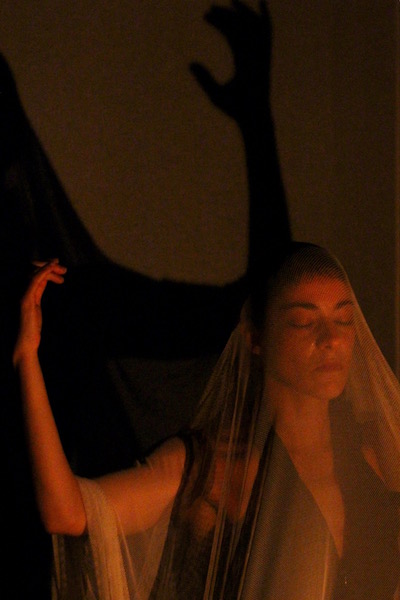 À ses côtés, la danseuse joue et danse avec un voile la recouvrant au plus près des spectateurs. Son ombre projetée par une lumière en fond de scène, la transforme et peut évoquer ainsi quelques dessins inconnus de Jean Cocteau.