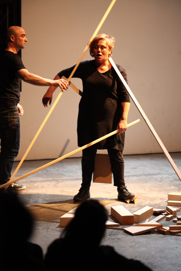 La simplicité de Dual fait sa force. Instruments de musique, outils et matériaux de bricolage se mélangent au sol et dans la partition, plastique ou sonore. Le corps de la chanteuse s’intègre dans une sculpture de bois, construite en direct. Le son d’un bout de bois qui tombe ou d’une chaise peut instruire les vocalises stridentes de Bergerault qui peuvent à leur tour évoquer des sons de bricolage. Ce retour au Bauhaus (dans tous les sens du terme allemand) résonne avec clarté et facétie. C’est ce qui s’appelle: Enfoncer le clou. Dual était la révélation de la soirée.