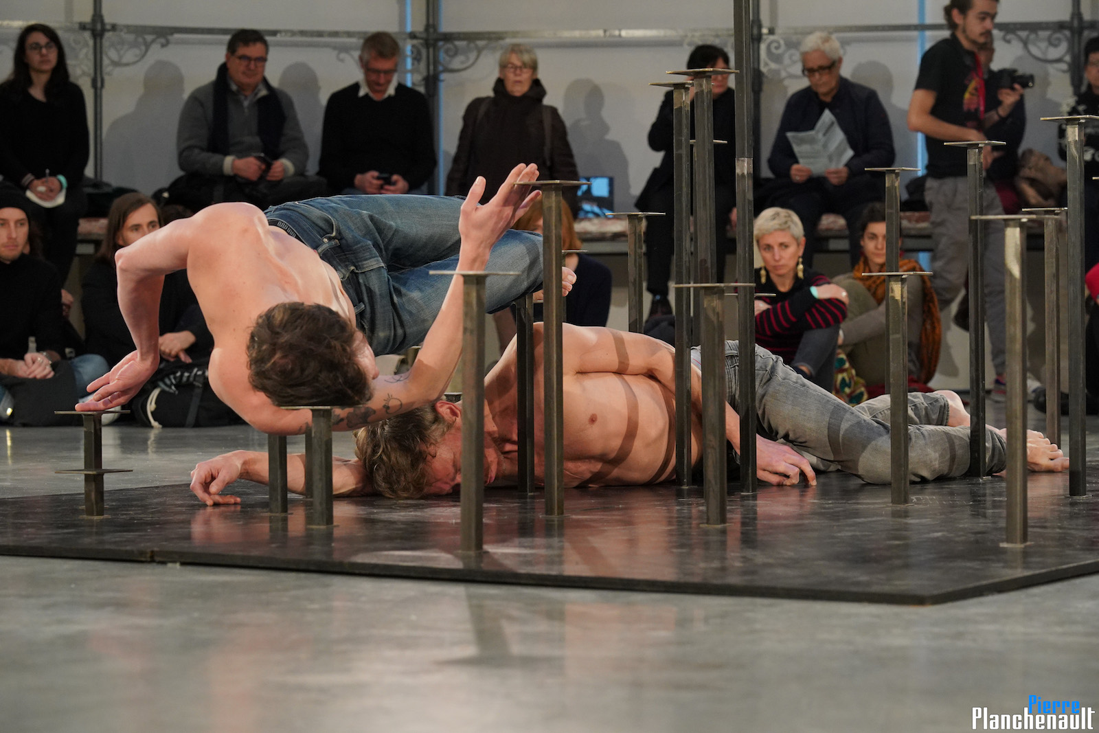Puis, l’un après l’autre, ils se déshabillent. Une fois nus, on aperçoit les traces laissées par les socles en acier sur leurs corps. Poursuivant leurs explorations de la chute, ces deux hommes et cette femme engendrent une ambiance saisissante où la pureté s’installe en contradiction avec l’accident qui a provoqué l’effondrement d’un être.