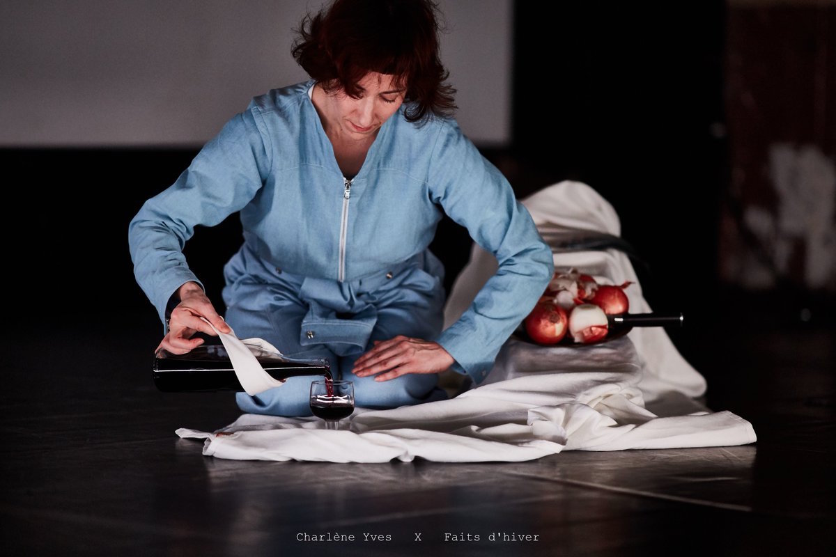 Elle se prépare à faire la cuisine (pour nous ?), et fait monter le suspense, jusqu’à ce que son couteau tranche l’oignon épluché par ses soins, tombant tel un couperet (ou la main d’un karateka tranchant une brique). Mutel accomplit une série d’actions et part sur les chemins qui les relient tel un pèlerin. Elle fait face à un étau, avance à genoux, tire une énorme planche de bois brut et sort un énorme couteau de son tablier qui est autant une robe de geisha ou de samurai. On serait tenté de parler de lenteur, mais comme en butô, il s’agit d’un état, et d’ouverture. Les butokas le vivent de l’intérieur. Chez Mutel, tout est dans l’adresse au monde et aux spectateurs. Elle crée des natures mortes, des scènes de crime ou de violence, montrant ce qui reste d’un acte ou qui le précède. Ses poses et images sculpturales sont tranchantes comme l’énorme couteau de cuisine, énigmatiques ou symboliques, comme le poisson qu’elle tient entre les dents et qu’elle finit par percer, comme dans un rite.