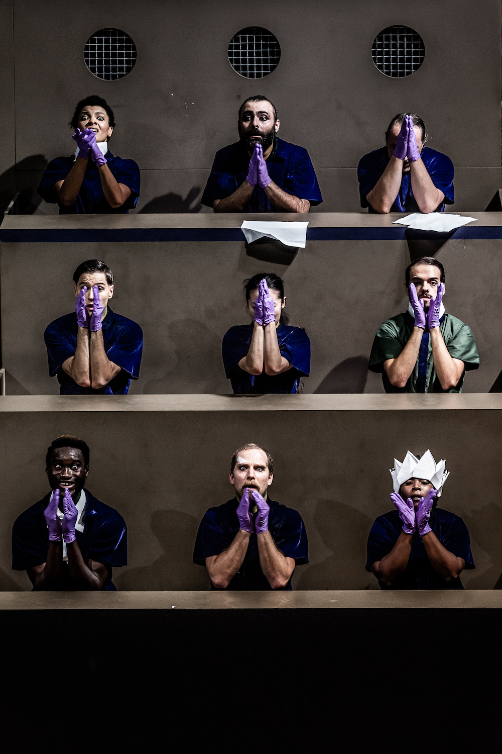 Le dispositif unique de Mal - Embriaguez Divina,dans lequel resteront coincés pendant près de deux heures les neuf (remarquables !) interprètes, semble tout droit sorti de cette nouvelle. Il y a aussi quelque chose des grands procès de l’Histoire, du type de l’Inquisition ou de Nuremberg, dans ce dispositif-là.