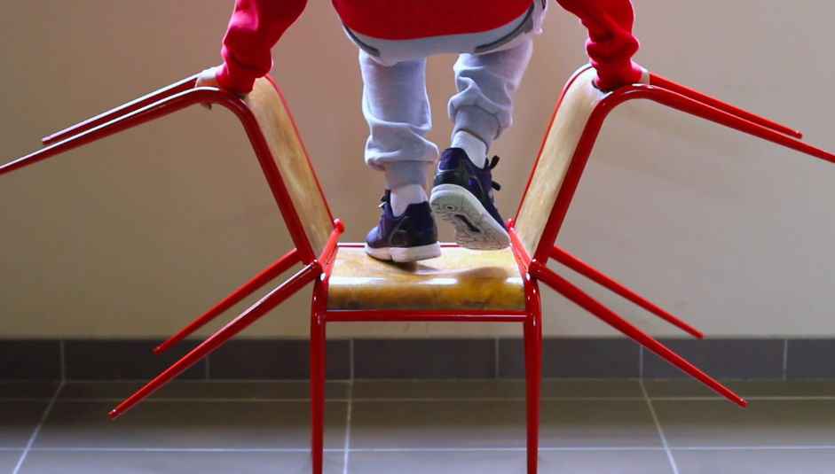 Laure Delamotte-Legrand : Nous avons démarré avec un groupe d’adolescents. Avec un gros temps d’ateliers en arts plastiques, un gros temps d’ateliers en corps et, pour leur faire comprendre qu’à un moment ces deux choses-là se rejoignaient pour arriver au tournage, nous avons établi avec eux, durant six mois, un langage commun. Avec des objets communs, des chaises particulières qui ne viennent pas de n’importe où. Lors des ateliers d’arts plastiques, nous avons travaillé à partir de ces objets, donc les chaises de classe. Je leur ai fait faire tout un travail de montage, démontage, remontage. Je leur ai fait assembler des chaises au scotch. Nous avons fait de nombreux croquis. J’ai dessiné les chaises qui apparaissent dans le film, des objets un peu étranges. Avec Julie, les enfants ont travaillé avec des chaises qu’ils avaient eux-mêmes déjà transformées. Ils étaient tendus vers cet objectif de film. Nous leur avons dit : « Vous êtes nos acteurs, nos danseurs. Ce sera vous, mais pas vous, ça vous dépassera. » Nous les avons amenés dans quelque chose qui les transcendait par rapport à ce qu’ils ont l’habitude de vivre dans l’établissement scolaire. Quand nous avons démarré, les élèves n’osaient même pas se donner la main. Il y avait beaucoup de violence. Assez vite, Julie et moi nous sommes dit les chaises seraient des endroits de rencontre à deux ou à trois, des espaces où nous n’allions travailler que la douceur et la lenteur. Faire en sorte, pendant plusieurs mois, que ces notions entrent en eux. Qu’ils arrivent à se regarder, à faire des choses très simples comme s’appuyer l’un contre l’autre, être en respect du camarade en face, petit à petit constituer des choses mais en petits groupes. Ce processus qui va des arts plastiques aux corps est très puissant dans le chemin que cela fait suivre aux participants. Et lors des prises de vue, ils voulaient tous tourner, ils voulaient tous faire des trucs, ils voulaient retourner plusieurs fois. Il n’y avait plus de difficultés à ce qu’ils se regardent dans les yeux, à ce qu’ils se touchent le corps. Julie a fait un énorme travail avec eux sur la lenteur.