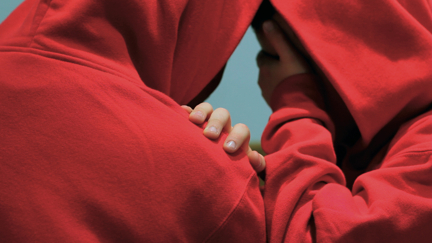 Laure Delamotte-Legrand : Le rouge, ça date d’œuvres plus anciennes. Je m’étais rendu compte que, pour ce qui est des vêtements, le rouge était la seule couleur qui apparaissait à l’image de manière évidente. Les chaises sont donc arrivées en rouge et les sweats étaient généralement les tenues des adolescents. Dans les impros, ils avaient tendance à se planquer et à mettre la capuche ! À partir du moment où ils mettent la capuche, ils deviennent autres, ils sont invisibles ou ailleurs. Il me paraissait évident que pour les films, il ne fallait pas qu’ils aient leurs vêtements mais qu’ils enfilent quelque chose qui ne leur appartienne pas.