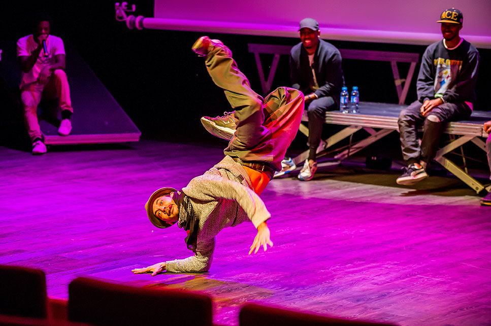 Romuald Brizolier : Ce que nous appelons la troupe HHG défie les candidats. Toutes les branches du hip-hop sont représentées. C’est pourquoi j’ai appelé ce concours Hip Hop Games et non Dance Games. Le MC n’est pas seulement un speaker c’est un MC triple champion de France d’improvisation verbale, on a un DJ, Philémon, un DJ compositeur, Tismé, un beatboxeur, Mystraw qui est dans le top 4, un graphiste Andry Charles, VJ, qui vient du street art et fait de la BD, de l’animation 2D,3D et moi qui suis danseur et chorégraphe mais joue un rôle d’arbitre. Du coup, toutes les branches du hip-hop bornent l’événement. Nous nous connaissons depuis 12 ans, il y a vraiment une connexion sur scène entre nous, même si nos parties sont plus ou moins écrites pour donner un cadre, et un déroulé précis, mais il reste une grande partie d’improvisation surtout maintenant, qu’il existe une interaction avec le public.