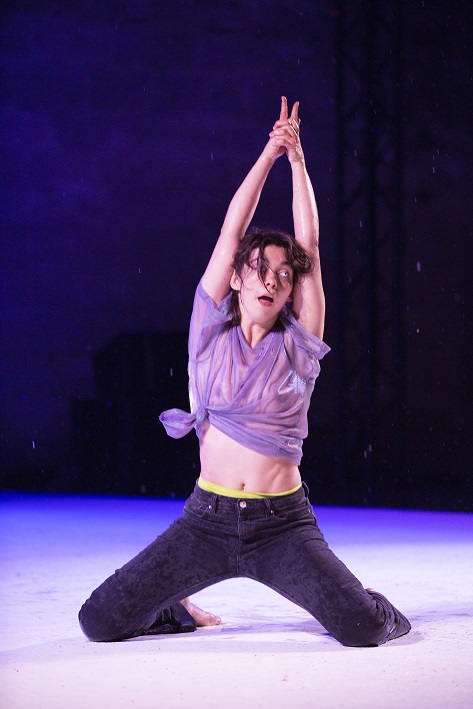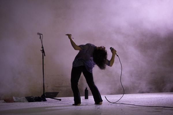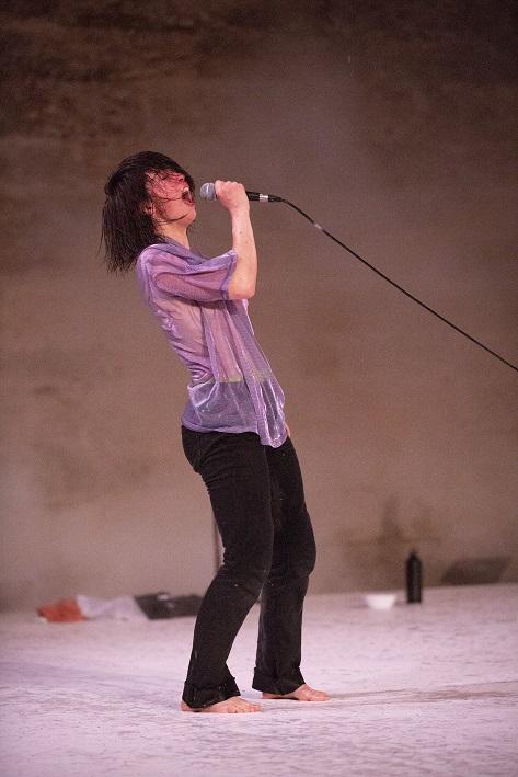 Le présent, à ce moment-là, c’est qu’elle se trouve sur le plateau de l’Evêché d’Uzès, sous un ciel très chargé, et qu’il se met à pleuvoir. De plus en plus fort. C’est pourtant elle qui demande au public : « Are you OK ? » (elle parle uniquement anglais dans cette pièce). Et elle résiste, et résiste, jusqu’à ce que les trombes d’eau fassent ressortir sa force rebelle quand elle lève le poing et tourne à la manière d’une derviche.
