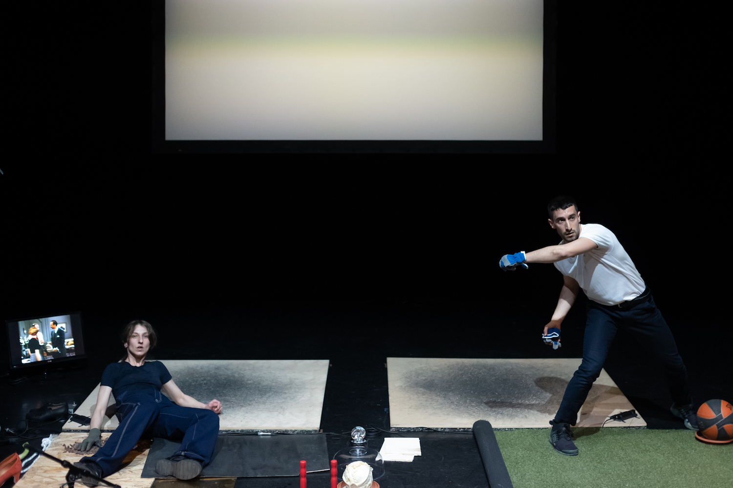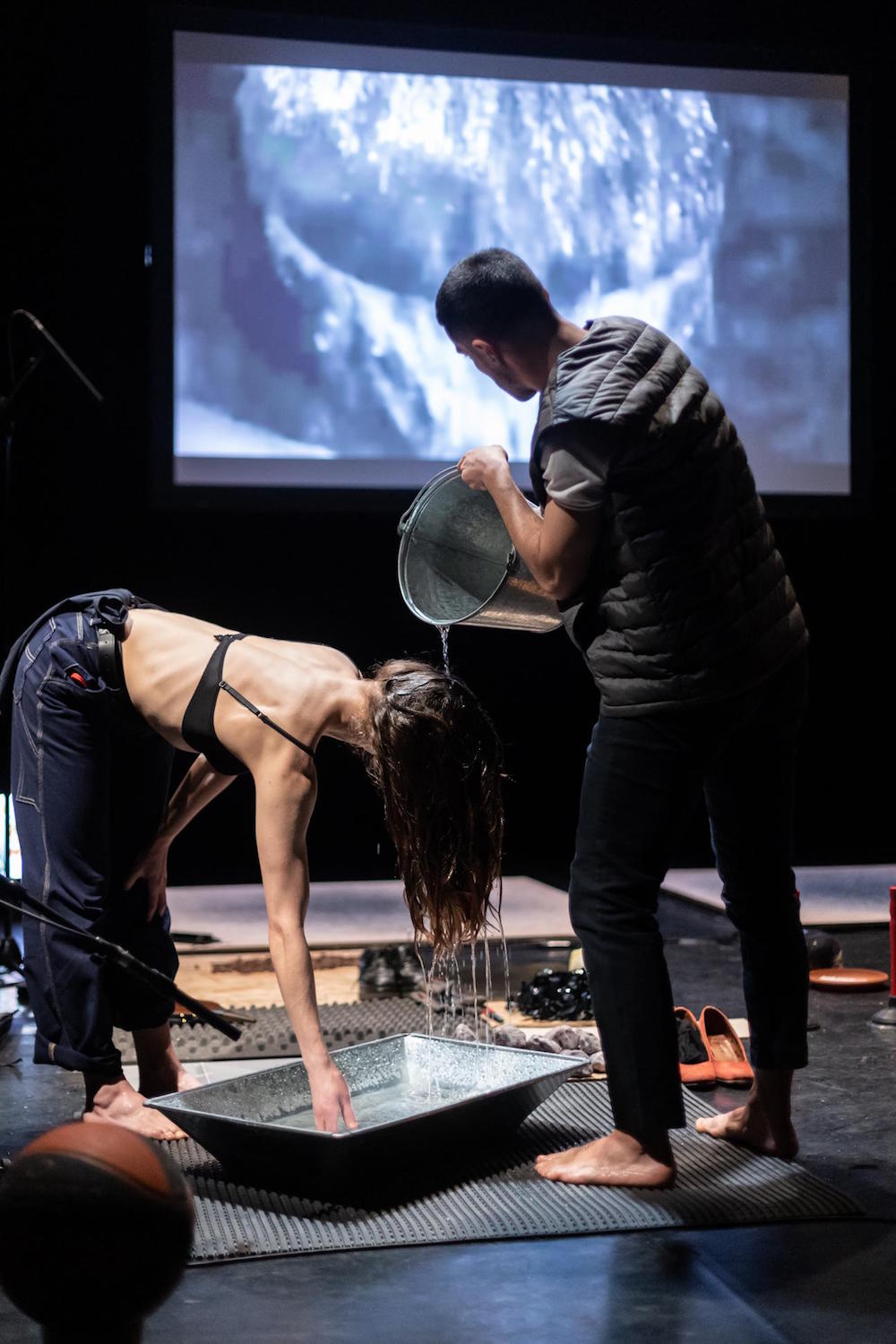 Dans leur foley-tude, Paraskevopoulou et son partenaire Georgios Kotsifakis retournent la situation dans tous les sens. Le public, lui, tourne le cou quand l’image est soudainement projetée dans son dos, laissant l’écran du fond de plateau vierge. Si la torsion peut fatiguer, on n’est pas sans pouvoir choisir sa position. Il suffit de regarder le plateau seul, en reconnaissant que l’activité des foleys (bruiteurs) se suffit entièrement pour faire spectacle. L’image, on l’imagine. Sans jeu de mots, mais à partir d’un jeu de scène où l’image et le son se superposent et se contredisent. Quand Paraskevopoulou se lave et sèche les cheveux, c’est Kotsifakis qui produit les sons, de ses pieds ! Le foley sait mettre image et son sens dessus-dessous !
