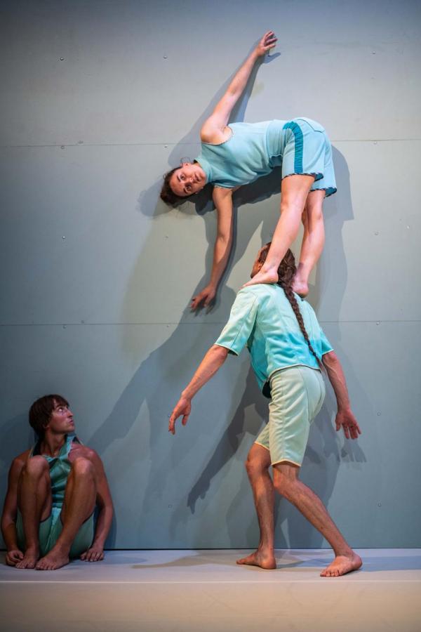 En s’accrochant à la paroi du fond, la tête vers le bas ou le corps en horizontale, ou bien au sol, en marchant sur les genoux de l’autre, ils créent des sensations de vertige rien qu’en associant leurs corps à d’autres corps, encore et encore. Tel pied ou tel membre se rallie à telle tête, épaule ou bassin, faisant fi de la gravité grâce à l’énergie des élancements, sans oublier une panoplie des portés les plus stupéfiants.