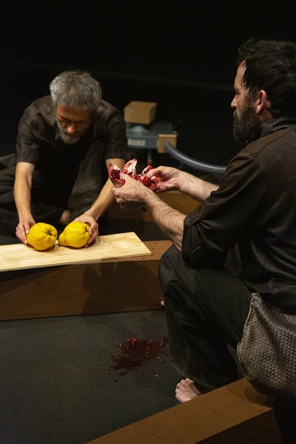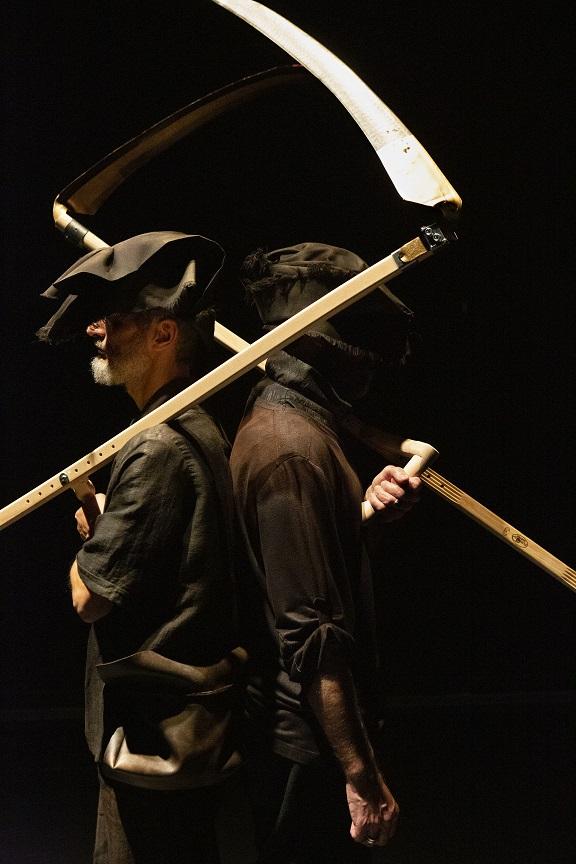 Après Not I, solo de Mutel en personne, le duo pour Kerem Gelebek et Philippe Chosson est le deuxième volet d’une quadrilogie, encore à compléter. Et comme dans Not I, on voit se constituer une nature morte, faite de nourriture et d’ustensiles de cuisine, nécessaires à sa préparation. Comme dans Not I, la conscience aigüe de chaque geste chorégraphique ou musical et un rapport au temps étendu laissent planer une ambiance nipponne qui croise le terroir français. D’autres éléments rappellent des danses macabres : Fauchage de blé à la faux, chasse aux pommes grenades comme pour abattre des oiseaux, par un duo de chasseurs en uniformes noires.