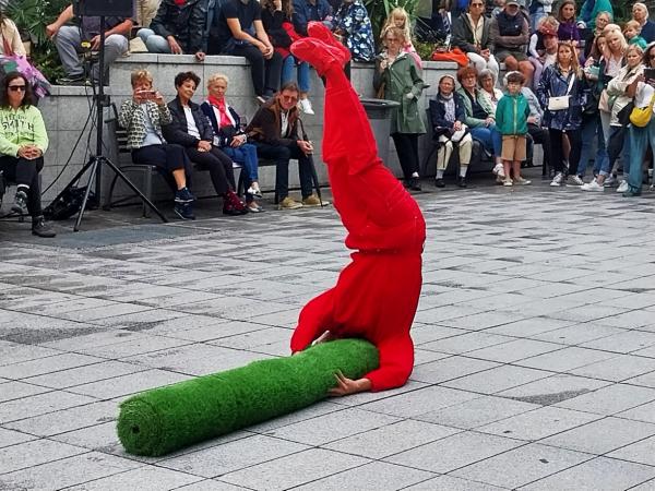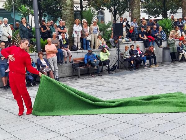 Le Temps d’aimer affiche avec conviction sa vocation transfrontalière. Non seulement par une virée de la programmation à Errenteria, en Pays Basque espagnol, mais aussi et surtout par la venue de compagnies de Navarre. Le rouge et le vert étant les couleurs du drapeau basque, la référence était parfaitement lisible quand le B-Boy Aritz Lopez (Cie Proyecto Larrua) débarqua avec une réinterprétation fulgurante de ce code chromatique : Rouge pétant pour sa combinaison d’ouvrier-toréador et vert pour les paysages du Pays Basque, condensés dans un rouleau de gazon.