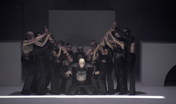 Mais la bête était bien présente ! Avec ses longs cheveux noirs et son masque de bouc, Sun-A Lee joua un peu sur la peur, mais surtout sur les comportements très masculins, avant de révéler la fragilité dissimulée par tant d’attitudes grandiloquentes. Elle ne croyait pas si bien tomber, à Biarritz. « Le bouc a une grande importance au pays Basque », confirma Thierry Malandain. Et pas que lui. Les sports basques – on pouvait lire dans certaines figures de Sangre y clorofila des allusions à ce répertoire si particulier – ainsi que les danses et rituels (comme chaque année déployés sur la place publique) ne sont pas en reste. Et on pouvait tout à fait lire chez Sun-A Lee, dans la création du quatuor Re Cover, l’invention d’un rite ancestral fictif résonnant parfaitement avec ce territoire.