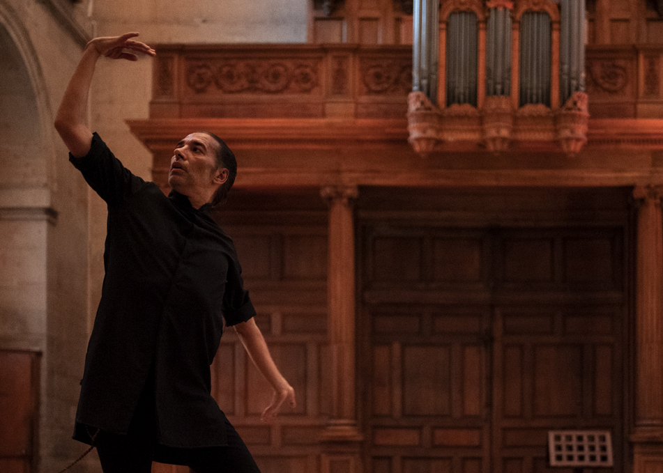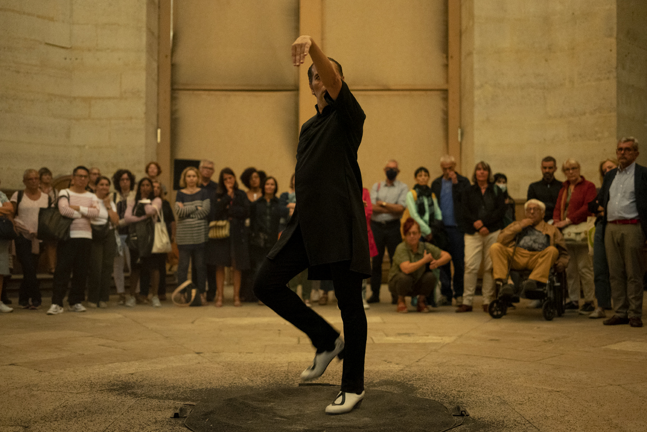 Sur un sol en pierre, Galván fait résonner les fers sous ses talons, au point qu’on s’inquiète pour ses chevilles. Il trace sa route à travers la chapelle, s’arrête ici ou là, devient tour operateur et chef de son propre orchestre corporel. Car l’idée d’un corps-orchestre n’a rien de farfelu quand on voit comment le danseur fait feu de tout bois. En traversant une rampe, il fait trembler le sol et nos tympans, en tournant dans un rond de sable noir il produit un son granuleux et continu. Parfois le tremblement des jambes semble déjà produire une musique. Mais il peut aussi enlever ses bottines pour danser en silence, sur un matelas de mousse, au pied du grand orgue de la chapelle qui cache son organiste comme dans une armoire.