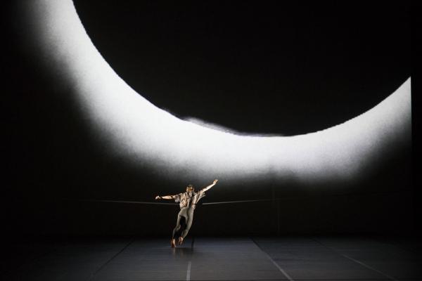 Plutôt qu’une sorte d’exposition vivante, cette pièce est un hommage à partir des univers de chaque artiste qui y met son grain, dont Tomás Saraceno. Le célèbre plasticien et activiste en matière de changement climatique signe une scénographie prenant la forme d’une œuvre vidéo abstraite réalisée en noir et blanc. Ces ombres mouvantes sont un véritable personnage de la pièce, qui évoque peut-être des fantômes, et plus tard, avec plus de certitude, une éclipse solaire. L’ombre de Klein ?