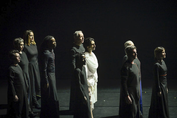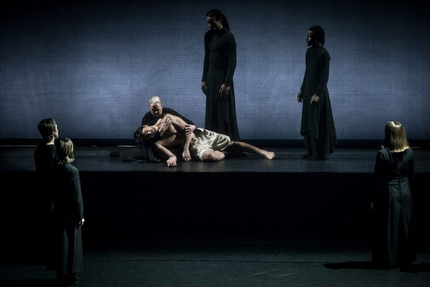 De toutes les expériences menées par Dianor avec DJs ou musiciens sur le plateau, Gesualdo Passione est la plus complexe. De loin. Entre chant et danse, tragédie et espérance, ténèbres et élévation, morale religieuse et passion brulante, mouvement et voix, Gesualdo Passione  se reflète en une dichotomie réunissant sur le plateau des facettes contraires qui en deviennent complémentaires. La grande réussite de la rencontre entre Paul Agnew et Amala Dianor se joue sur ce terrain partagé où danseurs et chanteurs se relient d’abord par des gestes sobres, profonds et efficaces, avant que les personnages chorégraphiques, dont Jésus (Damiano Bigi) et Judas (Clément Nikiema), ne se distinguent par leurs virtuosités personnelles ou collectives. Mais jamais l’unité ne rompt entre les chanteurs et les danseurs. Tout relève d’un souffle partagé, même quand les chanteurs s’alignent pour laisser le plateau aux danseurs, après avoir évoqué par leurs corps et gestes des moments-clés, jusqu’à la crucifixion.