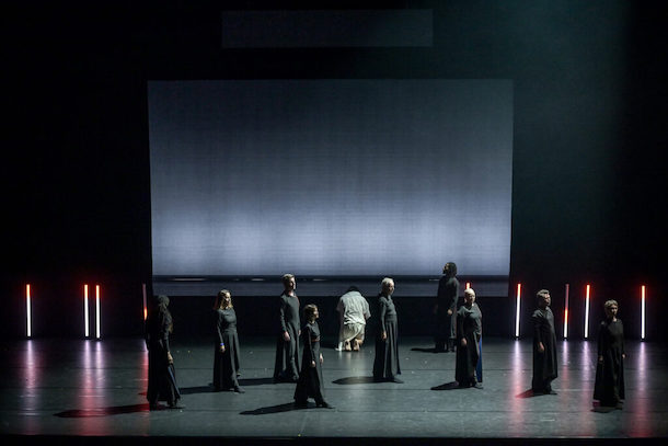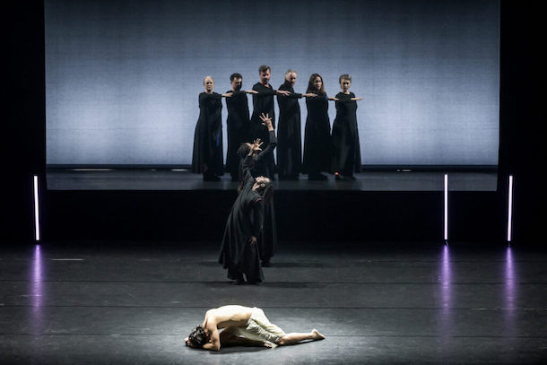Sur l’énorme écran en fond de scène – il doit bien mesurer entre cinq et six mètres – aucune vidéo n’est projetée. Surgissent des ambiances et nuances comme sur un cyclo, tout en donnant à l’ensemble une profondeur supplémentaire, annonçant la lumière que l’on sait, au bout de la traversée non moins mystique. Dans la jonction entre la vie et la mort, cet éclairage permet parfois aux danseurs et chanteurs de former des tableaux vivants, finement sculptés en ombres chinoises. Dianor ne croise ici pas seulement la musique ancienne en son passage de la Renaissance au Baroque, mais en épouse avec bonheur certains codes picturaux. Sa rencontre avec Les Arts Florissants lui ouvre de nouvelles voies, l’amenant sur un autre terrain. Avec le très dynamique Dub, le très ludique Coquilles et le sobrissime Gesualdo Passione, l’ancien B-Boy, danseur contemporain et interprète d’Emanuel Gat montre qu’il est aujourd‘hui à l’aise dans les esthétiques et univers les plus différents. L’entrée en territoire baroque est réussie. Désormais, toutes les surprises sont possibles.