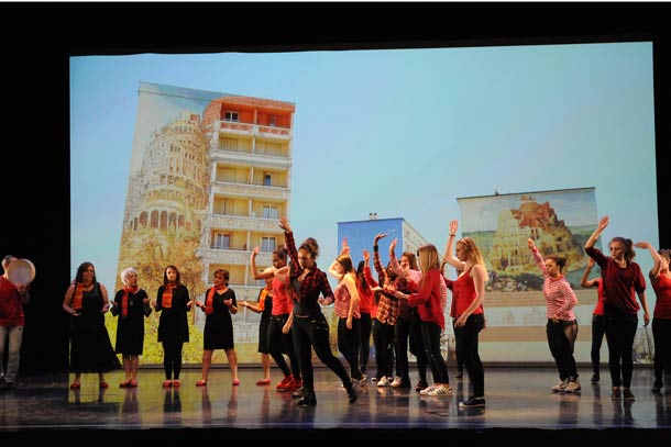 Dignité des interprètes si beaux dans leurs différences, solidité du propos artistique, engagement absolu au service d’une création commune : il semble que le fameux ‘vivre ensemble’ ait trouvé sur le plateau de la Maison de la danse son incarnation la plus enthousiasmante. Le spectacle s’ouvre sur un défilé des 250 participants, tous vêtus de rouge : surgis des coulisses ou descendus du haut de la salle, ils marchent calmement les uns derrière les autres, longue colonne fière d’une humanité en marche. Il se clôt une heure trente plus tard sur une explosion de joie collective, après que chacun ait pris sa part de la création commune. Ce sont par exemple ces chants berbères, interprétés par des femmes européennes et sur lesquels dansent des jeunes gens « nés en France ». Ou bien ce duo quasi acrobatique entre une fragile mamie aux cheveux blancs et un grand hip-hopeur à la peau noire.
