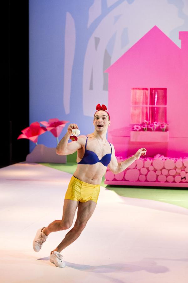 Elle ose tout, Laura Scozzi. Et le plus épatant, c’est qu’elle le réussit. Ainsi de cette « Barbe-Neige et les Sept Petits Cochons au bois dormant », une relecture des contes de fées tricotée façon hip hop et qui pourtant, sur l’échelle des risques, se situait plutôt en haut des marches. Avec une troupe d’interprètes au top, pour la moitié eux-mêmes par ailleurs chorégraphes*, elle relève haut et fort le défi de s’adresser non seulement à tous les publics, comme en témoignait en ce week-end d’ouverture du festival le nombre d’enfants dans la salle, mais surtout à toutes les intelligences. Nul besoin, en effet, d’avoir lu Bettelheim* pour repérer, dans sa savante déconstruction de certaines scènes-clés des contes les plus célèbres, le surgissement de pulsions primaires libératrices donnant lieu à quelques épisodes hautement lubrico-comiques, comme ces trois danseuses petits cochons draguant ouvertement le loup ou ces Cendrillons en string…