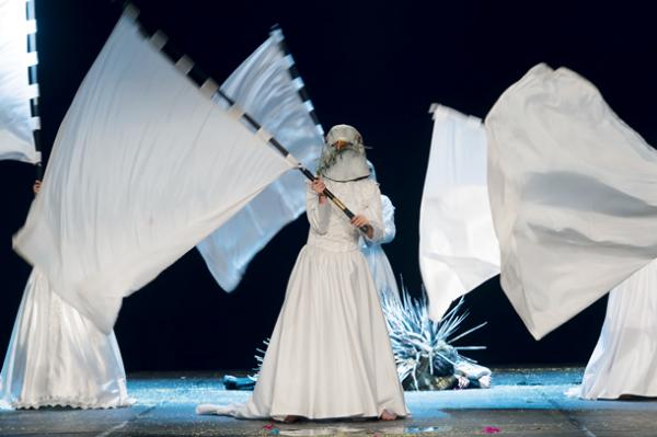 . Il y a des images saisissantes comme le fantôme des jeunes filles vendues et le banquet funèbre, la danse avec les encensoirs, qui se révèlent suspendus aux sexes des interprètes masculins et féminins, et les « rules » (les fameuses règles édictant interdictions et obligations toutes plus surréalistes les unes que les autres) énoncées lors de performances marathon comme les apprécie le chorégraphe – plasticien – metteur en scène avec pour agrès gymnique des caisses de bières à porter comme au chemin de croix, tandis que la Vierge Marie éponge le front de nos performeurs, un solo sublime d’Annabelle Chambon avec sa ceinture de bière, et la course à la mort. Tout finit par une danse des drapeaux où les pigeons deviennent les colombes de la Paix et finit par nous dire, « règle 40 » qu’ « il est possible d’être Belge » et que « L’Union fait la force », devise de ce « pays si petit qu’on peut le rater quand on le traverse ».