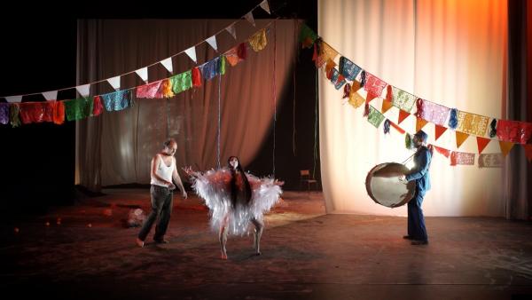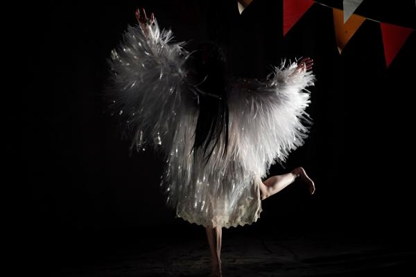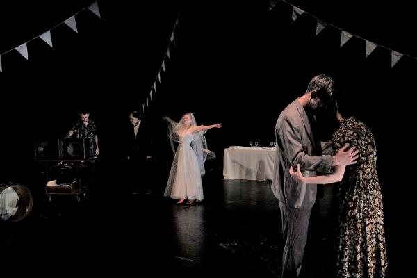 Le vrai fantôme, c’est Marie Urvoy, dans sa robe blanche, les longs cheveux noirs tourbillonnant au gré de sublimes solos, dansés hors du temps et hors sol. Sous sa présence énigmatique et son énergie de revenante, la table de banquet – sous laquelle on avait plus tôt caché (le fantôme de) la mariée – s’effondre et un torrent de plâtre se déverse sur le plateau. Chacun.e libère alors sa part sauvage et son animalité. Même le faisan n’est plus à déguster, mais sert de couvre-chef et fait voler en éclats le sérieux de la photo de famille. A chaque round de réincarnation, l’image rituelle se dilate un peu plus, révélant une histoire tourmentée.