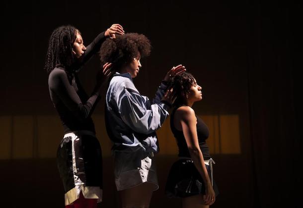 Totêm s’ouvre sur le trio en train de lancer des objets imaginaires, entre krump et un long tableau tout en résistance et en revendication, en suspens et en suspension où Loanga réussit à révéler la force d’une énergie tout en la contenant. Dans un tableau remarquable, les mains des trois danseurs ne cessent de se poser sur les visages des uns et des autres, construisant des compositions complexes et surprenantes de bras, mains et têtes. Picasso n’est pas loin…