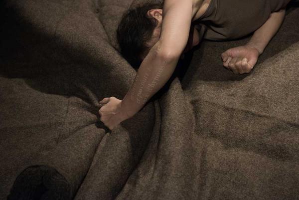 Ion tranche sur cette toile de fond. À cet égard, son entrée en matière performative, dès le hall du théâtre, met la puce à l'oreille. On y voit la danseuse extrêmement contrainte, insérée et compactée dans une cage de verre – littéralement, un aquarium (mais sans eau). Comme tatouée à même sa peau, elle se montre là porteuse d'une abondante écriture littéraire et philosophique.