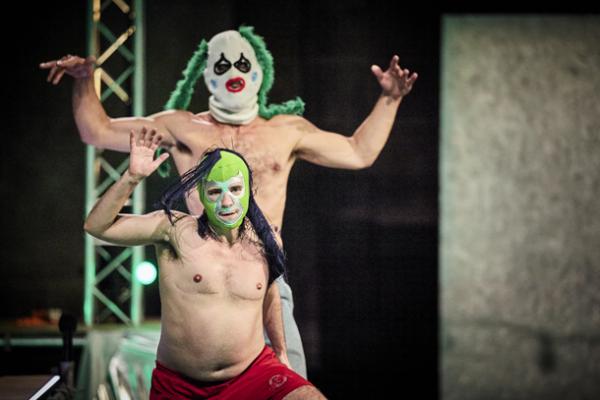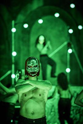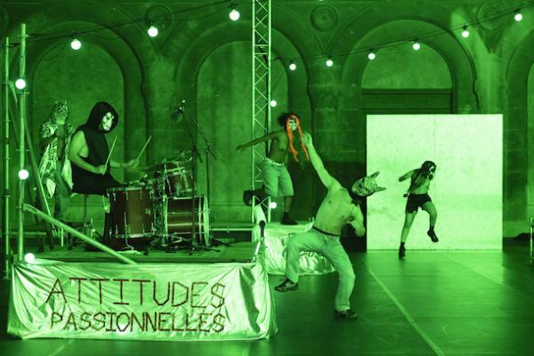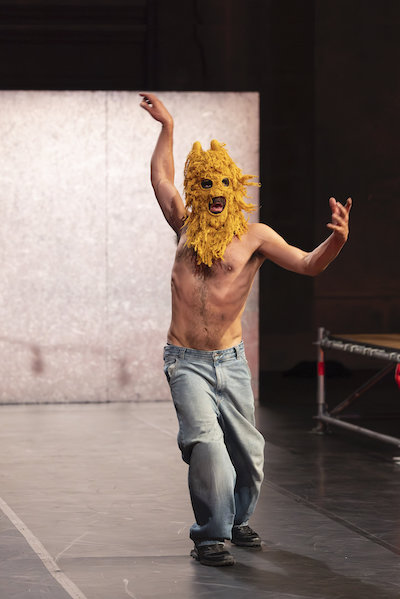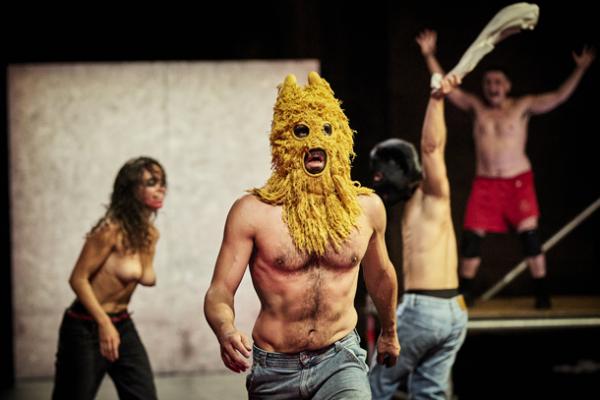 Les corps masqués et à demi-nus déferlent sur scène dans une gestuelle brutale, animale, libérée. La batterie frénétique de Will Guthrie rythme cette marée gestuelle aux contours flous mais puissants. La pulsation répétée sert de chorégraphie tant elle envahit les corps et les esprits de son énergie implacable qui laisse peu de latitude pour y échapper.