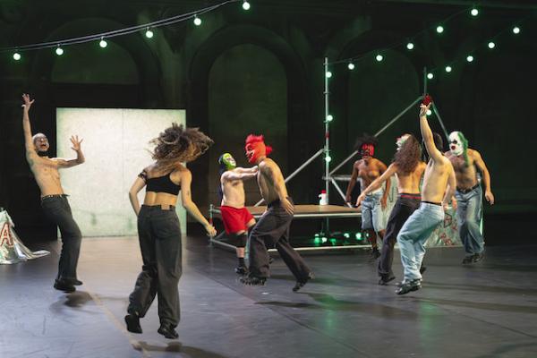 Transformant l’espace scénique en aire de fête, avec ses lampions qui passent du vert absinthe à toutes les couleurs de l’arc-en-ciel, convoquant un terrain de lutte et de résilience avec ses passerelles, podiums, micros et portes voix, Mette Ingvartsen crée une esthétique du débordement. Entre les masques de têtes de mort, de clown, de monstres, de lion-wookie, et de je-ne-sais-quoi, les cris amplifiés par des mégaphones, les mouvements, tout en ondulations, battements, courses éperdues, et coups de pied, Delirious Night ne se veut ni linéaire ni explicatif : Ingvartsen crée une chorégraphie de la démesure où l’extase devient résistance.