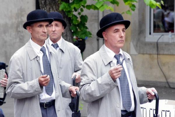 Pas d'oranges bleues dans les poches de leurs impers, mais ils présentent, d'une façon bien laconique, une idée de Dali, comme pour nous dire: ceci n'est pas une montre ! Dans leur lenteur anti-rhinocéros, ils apparaissent, en toute liberté, comme l'uniformité qui marque sa différence avec les temps qui courent. Avec eux, le temps s’arrête, comme dans un tableau de Magritte.